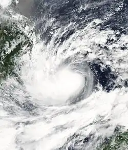 Several hours before making landfall along the western coast of Luzon on May 7, an eye-feature began to develop. Satellite imagery depicted a depression in the cloud cover over the center of circulation as well as a broken ring of deep convection.[5] In light of this information, the JTWC assessed Chan-hom to have reached its peak intensity at this time, packing sustained winds of 160 km/h (99 mph) and an estimated barometric pressure of 956 mbar (hPa; 28.23 inHg).[4] However, the JMA stated that the typhoon was slightly weaker, having maximum winds of 120 km/h (75 km/h) and a pressure of 975 mbar (hPa; 28.79 inHg).[2] Just prior to crossing the coastline, the storm began to weaken as wind shear increased. Within hours of moving over the mountainous terrain of northern Luzon, the cyclone quickly diminished. The low-level circulation became detached from convection and pressure readings over land indicated a minimum pressure around 1004 mbar (hPa; 29.65 inHg). Although wind shear remained at unfavorably high levels,[5] Chan-hom maintained tropical storm intensity through its crossing of Luzon through the end of May 8.[2][4]