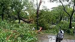 At least two people were killed in Taiwan.[29] Nearly 1 million households lost power and 720,000 lost water supply.[30] Agricultural damage exceeded NT$850 million (US$26.8 million).[31] A small lighthouse in Taitung County collapsed and rough seas unmoored 10 vessels in Kaohsiung Harbor.[27]