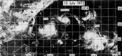 In early July 1972, conditions across the western Pacific were highly favorable for tropical cyclogenesis. Enhanced by an El Niño event, surface westerlies traversed the region south of an east–west near-equatorial trough that extended from east of the Philippines to well east of the Marshall Islands. On July 3, conditions in the upper troposphere over the basin underwent significant changes with two upper-level troughs developing in the midlatitudes; of note was one which moved southward from Japan. By July 5, four distinct disturbances had organized along the near-equatorial trough; however, limited data made further analysis on these systems difficult. The precursor to Rita specifically was situated to the southeast of Guam at this time.[2] The Japan Meteorological Agency (JMA) classified the system as a tropical depression at 12:00 UTC that day.[3]