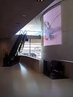 The Giant Panoramic Painting, that was transferred here in September 2010,[1] is the main exhibit of the museum. It depicts the Tyrolean Rebellion of 1809 on 1,000 square metres of canvas. Another focal point of the Tyrol Panorama is the permanent exhibition called the “Tyrolean Stage” ("Schauplatz Tirol"). Here, the themes of religion, nature, politics and man will be used to explain the "Tyrolean myth" by using exhibits. Furthermore, the new house is connected underground to the Kaiserjäger Museum, which is a "museum within the museum". The exhibition area is visually divided into four thematic areas. “Nature” is presented in a 40-metre-long showcase in which, among other things, a cable car gondola and stuffed animals, such as a bear and a beaver, are exhibited. “Politics" is located in the middle of the room, where, for example, the horse's head of the so-called "Aluminum Duce" monument in Bolzano or the valuable 1511 ‘’Landlibell’’ of Emperor Maximilian I are found. Interactive "tree trunks" show the "man" or "Tyrolean types". Here you can also find, for example, the pipe of former provincial governor, Eduard Wallnöfer, or a self-portrait of the painter, Anna Stainer-Knittel. The exhibits on "Religion" are housed in large glass showcases at the back of the main entrance foyer to the Kaiserjäger Museum. Among other things, a baroque pulpit and fresco designs from St. Theresa’s Church by Max Weiler are displayed here. Weiler mural of the “Archduke Ferdinand II and Philippine Welser at Schloss Ambras“ was transported to the Tyrol Panorama on 21 February 2011, where it hangs in the restaurant. From 1953 to 2000 the painting was hung in the dining room of the old Hotel Tyrol in Innsbruck.[2] The painting weighs a tonne, is 28 square metres in area and was painted in 24 individual sections.[3]