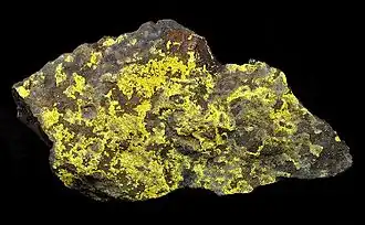 Tyuyamunite (pronounced tuh-YOO-ya-moon-ite) is a very rare uranium mineral with formula Ca(UO2)2V2O8·(5–8)H2O. It is a member of the carnotite group. It is a bright, canary-yellow color because of its high uranium content. Also, because of tyuyamunite's high uranium content, it is radioactive.[6] It was named by Konstantin Avtonomovich Nenadkevich, in 1912, after its type locality, Tyuya-Muyun, Fergana Valley, Kyrgyzstan.[3]