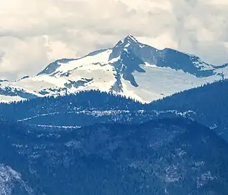 Tzoonie Mountain is located in the Coast Mountains, 75 kilometres (47 mi) northwest of Vancouver and 12 kilometres (7.5 mi) southwest of Mount Jimmy Jimmy, which is the nearest higher neighbor.[2] The highest point of the sprawling mountain is set three kilometres (1.9 mi) southwest of the point labeled as Tzoonie Mountain on maps.[2] Precipitation runoff and glacial meltwater from this mountain drains west to the Tzoonie River and east to the Clowhom River. Tzoonie Mountain is more notable for its rise above local terrain than for its absolute elevation as topographic relief is significant with the summit rising over 1,820 metres (5,970 ft) above the Tzoonie River in three kilometres (1.9 mi). The mountain is named in association with the Tzoonie River and the mountain's toponym was officially adopted on May 2, 1955, by the Geographical Names Board of Canada.[4] The indigenous word "Tzoonie" may be a variation of Ts’únay (or Tsonai), the name for a Sechelt people, whose members were based at Deserted Bay on Jervis Inlet.[5]