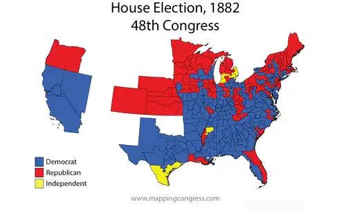 Following the 1880 census, 32 new seats were apportioned.[5] Three States lost 1 seat each, 13 States had no change in apportionment, 14 States gained 1 seat each, 6 States gained 2 seats, 1 State gained 4 seats, and 1 State gained 5 seats. Several States that gained one or more seats did not redistrict immediately, electing the new members at-large, while one state (Maine) which lost a member also delayed redistricting, electing all of its members at-large for this Congress only.