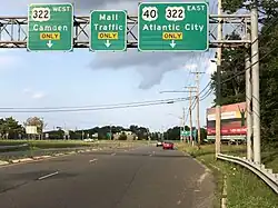 In the 1980s, Congressman William J. Hughes proposed a freeway along the US 40 corridor in order to alleviate increased traffic along that route following the legalization of gambling in Atlantic City. This freeway, which was to be maintained by the New Jersey Expressway Authority, was to run from the Delaware Memorial Bridge east to Atlantic City.[18] The NJDOT determined that the traffic volume on US 40 did not justify the construction of a freeway along the corridor.[19] The Cardiff Circle along US 40/US 322 at CR 563 and CR 608 in Egg Harbor Township was eliminated in a $3.7 million project completed in 2002.[20]