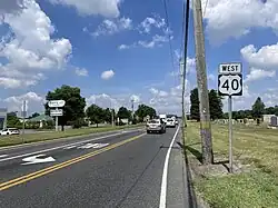 After Porchtown, US 40 crosses into Franklin Township in Gloucester County, turning southeast and running through more woods.[1][2] It comes to a cloverleaf interchange with Route 55, where US 40 is briefly a four-lane divided highway.[1] Past Route 55, the route continues past Malaga Lake and comes to the community of Malaga.[2] In Malaga, the route heads into a business district and intersects Route 47, turning to the northeast to run concurrent on a three-lane road with a center left-turn lane through inhabited areas. After passing over Conrail Shared Assets Operations' (CSAO) Vineland Secondary railroad line, US 40 and Route 47 split. Route 47 heads north and US 40 turns south and continues parallel to the railroad tracks.[1][2] The road makes a turn to the east-southeast, leaving Malaga and returning to areas of farmland and trees.[2] The road briefly runs along the northern border of Newfield before coming to a crossroads with CR 555.[1] After passing near the Vineland-Downstown Airport, US 40 intersects CR 557 and forms a concurrency with that route.[1][2]