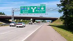 In 2003, US 64 was placed on new freeway between Plymouth and Columbia, leaving its concurrency alignment with NC 32 and NC 94.[35][36] In 2005, US 64 was placed on a freeway bypass north of Pittsboro; its old alignment became US 64 Bus.[37][38] In 2006, US 64/US 264 was placed on new six-lane freeway bypass south of Knightdale, from I-440 to existing US 64 freeway segment near Eagle Rock; its former routing through Knightdale became an extension of US 64 Bus., with a hidden 1-mile (1.6 km) concurrency along I-440.[39][40] Also in the same year, NCDOT submitted a request, which was subsequently withdrawn to split-up US 64 through Brevard; instead US 64 Bus. was reestablished along Caldwell Street as a hidden route, signed instead as westbound US 64, eastbound US 64 remains along Broad Street.[41] Later that year, a two-year project concluded that widened US 64 from six to eight lanes on its concurrency with US 1 in Cary from Tyron Road to just south of the I-40/I-440 interchange; the interchanges with Cary Parkway (US 1 exit 99) and Walnut Street (exit 101) were also reconfigured.[42] In 2009, US 64 was placed on new routing .16-mile (0.26 km) east of its intersection with US 19/74/129 in Murphy, next to the Hiwassee River.[43] Its old alignment was to become a new alternate route, but that request was denied by AASHTO. The old alignment instead was downgraded to secondary roads (it was eventually upgraded to be an alternate route); NC 141 was extended .7-mile (1.1 km) south to meet the new route.[44][45][46] The .7 mile extension was also on an even older alignment of US 64 (Old US 64) that was moved sometime around the 1970s. On October 1, 2012, I-40 exit 153 to US 64 was permanently closed by the NCDOT due to the redesigning of the I-40/I-77 interchange.