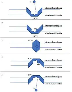- ^ a b Crichton PG, Lee Y, Kunji ER (2017-03-01). "The molecular features of uncoupling protein 1 support a conventional mitochondrial carrier-like mechanism". Biochimie. UCP1: 40 years and beyond. 134: 35–50. doi:10.1016/j.biochi.2016.12.016. ISSN 0300-9084. PMC 5395090. PMID 28057583.
