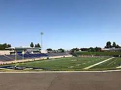 Toomey Field is located on the campus of the University of California, Davis in unincorporated Yolo County, California. The Woody Wilson Track is located in the stadium and it is home to the UC Davis Aggies track and field team.[7] At the northeast corner of campus, Aggie Field opened in 1949 and was home to the Aggies' football team through 2006. The first game, on November 18, was a 12–3 victory over Chico State. The record for attendance at the stadium was set on November 12, 1977, with 12,800 for a 37–21 victory over Nevada. The Aggies' all-time record at Toomey Field was 192–86–7 (.686). The stadium was renamed in 1962 in honor of Crip Toomey, who served as athletic director at UC Davis from 1928 until his death in 1961. Toomey graduated from UC Davis in 1923 and also served as the Aggies' basketball coach and football coach from 1928 to 1936.[8] The natural grass playing field (now track infield) was aligned north-northwest to south-southeast at an approximate elevation of fifty feet (15 m) above sea level.