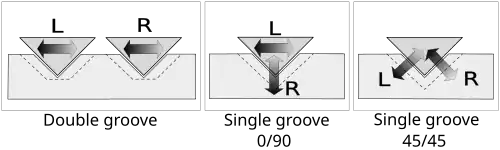 Patent 394325 put forward a third proposition: the single cutter should be driven by two orthogonal actuators, placed at 45° and −45° to the surface of the disc.[53] Polarities of electrical L and R signals that drive the actuators must be chosen in such a way that the lateral movement of the cutter corresponds to monaural signal M, and vertical movement corresponds to the difference between two stereo channels, S.[53] This ensures backward compatibility with traditional monaural pick-ups of the most common, lateral-cut system.[53]
