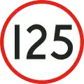 Permissible speed indicator. This example is displaying a maximum permissible speed of 125 mph (201 km/h). If the speed figure is on a yellow disc, it is an "enhanced permissible speed" that only applies to certain trains that are specifically engineered to run at this speed safely, such as tilting trains. If the speed figure is in white numerals on a black disc, it is in kilometres per hour instead of miles per hour.