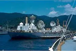 Extensive shipyard overhauls and drydocking were conducted in Brooklyn, New York; Baltimore, Maryland; San Juan, Puerto Rico; Long Beach, California; Pearl Harbor, Hawaii and Dakar in Senegal, Africa. Extensive technical enhancements in equipment [28-foot-diameter (8.5 m) L-band and UHF-band radar dish installation] were conducted in Cape Town, South Africa with the assistance of local technical personnel.