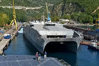 USNS Trenton (JHSV-5/T-EPF-5), (ex-Resolute) is the fifth Spearhead-class expeditionary fast transport, operated by the United States Navy's Military Sealift Command. Spearhead-class ships are used to support overseas operations, conduct humanitarian aid and disaster relief, and support special operations forces. This type of vessel also has an aviation flight deck and can operate in shallow waters.[6][7]