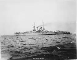 Arkansas was laid down on 25 January 1910, at New York Shipbuilding in Camden, New Jersey. She was launched on 14 January 1911, after which fitting-out work was effected. The ship was completed by September 1912, and was commissioned into the US Navy on 17 September, at the Philadelphia Navy Yard, under the command of Captain Roy C. Smith. Following her commissioning, Arkansas participated in a fleet review on 14 October 1912, for President William Howard Taft. The ship took Taft aboard that day for a trip to Panama to inspect the Panama Canal, which was still under construction. Arkansas began her shakedown cruise after delivering Taft and his entourage to the Canal Zone.[2] During this cruise, the Navy's first long-distance, continuous-wave, wireless telegraphy system was successfully tested, with regular transmissions received by Arkansas from a prototype Poulsen-arc transmission facility located in Arlington, Virginia.[4] On 26 December, she returned to the Canal Zone to take Taft to Key West, Florida. After completing the voyage, Arkansas was assigned to the Atlantic Fleet and participated in fleet maneuvers off the east coast of the United States. Arkansas's first overseas cruise, to the Mediterranean Sea, began in late October 1913. While there, she stopped in several ports, including Naples, Italy on 11 November, where the ship celebrated the birthday of King Victor Emmanuel III of Italy.[2]