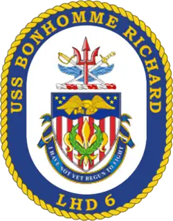 USS Bonhomme Richard (LHD-6) was a Wasp-class amphibious assault ship of the United States Navy commissioned on 15 August 1998. Like the previous five Wasp-class ships, Bonhomme Richard was designed to embark, deploy, and land elements of a Marine Corps landing force in amphibious assault operations by helicopter, landing craft, and amphibious vehicle, and, if needed, to act as a light aircraft carrier.