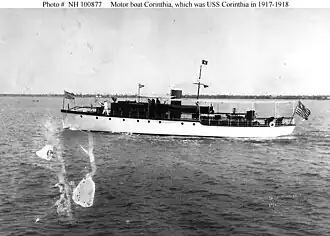 Corinthia was built as a private motorboat of the same name in 1909 by Charles Seabury & Company at Morris Heights in the Bronx, New York. In 1917, the U.S. Navy acquired her under a free lease from her owner for use as a section patrol boat during World War I. She was commissioned as USS Corinthia (SP-938) on 14 May 1917.