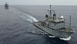 In January 2019, the ship transited from the Mediterranean Sea through the Dardanelles Strait and entered the Black Sea, later visiting the Romanian port of Constanța, a major base for the Romanian Navy. The ship was part of the USS Kearsarge Amphibious Ready Group (ARG), and was carrying the 22nd Marine Expeditionary Unit from Camp Lejeune, North Carolina.[7] In March 2019, she was quarantined for over three months following an outbreak of mumps. While quarantined, she continued to operate in 5th Fleet conducting a wide range of operations.[8] She was given short notice tasking to depart 5th Fleet and chop to 6th Fleet in support of BALTOPS 2019, a large scale Naval exercise bringing NATO and partner allies together.