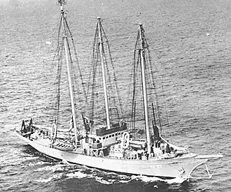 Guinevere was built for Edgar Palmer of New York who specified diesel electric propulsion for what was at the time the largest such yacht built in the United States and the largest fore and aft schooner yacht so far built worldwide.[2] The yacht's power plant consisted of two Winton six-cylinder, 350 hp (260 kW) diesel engines directly connected to Westinghouse generators.[3] The generators provided power to a 555 hp (414 kW) Westinghouse motor directly coupled to the propeller.[4] Design was by A. Loring Swansey with the diesel electric design in cooperation with a Commander Fisher, USN.[2] The yacht was rated for a speed of 11.5 knots (21.3 km/h; 13.2 mph) under engines alone with 11,000 mi (18,000 km) cruising range.[3] A two-ton refrigeration unit, two 15 kilowatt generators, bilge and other pumps, ventilation, power hoists, lights and radio were provided within the electrical system.[2] Batteries provided power at night when the power plant was shut down or in emergencies.[5] Guinevere was built by George Lawley & Son, of Neponset, Massachusetts, and launched 21 April 1921.[3][6][4]