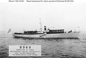 Kestrel II was built in 1912 as a private motor yacht of the same name by Percy Tuttle at Greenport on Long Island, New York, for D. Herbert Hostetter of New York City. On 2 June 1917, the U.S. Navy acquired her from her owner for use as a section patrol vessel during World War I. She was commissioned as USS Kestrel II (SP-529) on 4 June 1917 at Newport, Rhode Island.