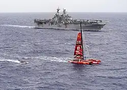 In October 2016 Makin Island was deployed alongside the US Coast Guard to search for missing Chinese sailor Guo Chuan, who was attempting to break the world record for solo sailing from San Francisco to Shanghai.[23] Makin Island reached his yacht, Qingdao China, on 27 October, but found her adrift with no sign of the sailor, roughly 620 miles (1,000 km) northwest of Oʻahu, Hawaiʻi.[24][25] After searching an area of 4,600 square miles (12,000 km2) without locating the missing sailor, Makin Island's crew recovered his personal items and left the yacht for later salvage.[26][27]