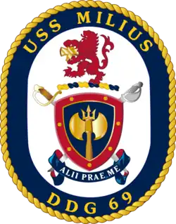 The ship's crest honors Captain Paul Lloyd Milius, commemorating his military service, courage, and selfless heroism.[11]