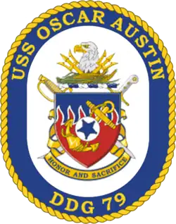 The coat of arms in full color as in the blazon, upon a white background enclosed within a dark blue oval border edged on the outside with a gold rope and bearing the inscription "USS Oscar Austin" at the top and "DDG 79" in the base all gold.