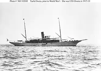 USS Owera (SP-167), was an armed yacht that served in the United States Navy as a patrol vessel from 1917 to 1919. The vessel, under the name O-We-Ra, was built as a steam yacht in Leith, Scotland in 1907 for Frederick H. Stevens of Buffalo, New York. In 1915 the yacht was sold to United States Senator Peter G. Gerry of Rhode Island and registered in Providence, Rhode Island as Owera.[note 2]
