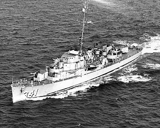 USS Raymond (DE-341) was a John C. Butler-class destroyer escort acquired by the U.S. Navy during World War II. The purpose of the destroyer escort was primarily to escort and protect ships in convoy, in addition to other tasks as assigned, such as patrol or radar picket. Post-war, she returned home with five battle stars to her credit, including credit for her striking a Japanese cruiser with her 5-inch (127 mm) guns during the Battle off Samar. The destroyer escort was named for Reginald Marbury Raymond, who was killed by enemy gunfire on 30 April 1943 aboard USS Scorpion.[1]