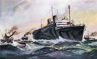 ![]() "Periscope" view of the Siboney in convoy, by Musician Loren C. Holmberg, USN (c. 1919), shows the dazzle camouflage applied to the ship during World War I.
