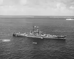 Immediately on arrival in Ulithi on 2 November, South Dakota sortied as part of TG 38.1, tasked with supporting ground forces ashore on Leyte that had encountered heavy Japanese resistance. On 4 November, South Dakota was transferred to TG 38.3 to support a group of four carriers launching strikes on Luzon the next day. The group came under air attack on the afternoon of 5 November; errant rounds from other ships accidentally killed a man and wounded seven more aboard South Dakota during the action. Another wave of aircraft approached the following morning, prompting the fleet to assume a defensive formation. The Japanese planes did not attack, however, and the fleet returned to its cruising formation. South Dakota spent the next several days refueling destroyers and replenishing her own fuel bunkers. The carriers launched another series of raids on 13 and 14 November before withdrawing to Ulithi, arriving on 17 November.[27]