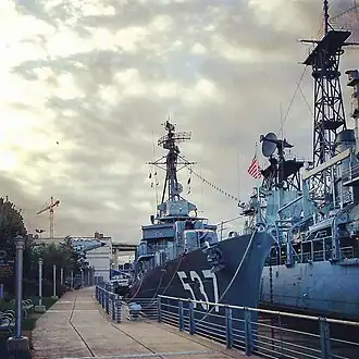 The ship was declared a National Historic Landmark in 1986.[5][6][7] On 26 February 2021 it was reported that The Sullivans was taking on water and listing. It was stated that the ship's age and possible weather damage were the most likely cause for the leak below the waterline.[8]