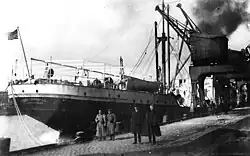 Setting out four days later, West Carnifax was slated to sail to Danzig via Falmouth and the Hook of Holland, but was diverted en route.[4] When she arrived at her new destination of Hamburg on 25 March,[8] she became the first American ship to dock in that city since before World War I had begun over 4+12 years before.[9] When she had completed unloading her cargo of flour, noted as the "choicest California flour" by onlookers,[10] she sailed for New Orleans by way of Plymouth on 2 April. On 9 May, four days after her arrival at New Orleans, West Carnifax was decommissioned and returned to the USSB.[4]