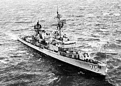 Following almost 13 months of 2nd Fleet operations during late 1971 and early 1972, the warship embarked upon an extended assignment to the 6th Fleet on 18 August. Her home port was officially changed to Elefsis (Athens), Greece, from which port she operated for almost three years. The warship spent most of her time during that period engaged in training operations with other units of the 6th Fleet and with elements of Allied navies, including conducting surveillance of the Soviet Fleet in the Mediterranean. She also made several forays into the Black Sea for special operations (Operation Silver Fox). In July and August 1974, she conducted continuous patrols in the vicinity of Crete during the Turkish invasion of Cyprus.[1]