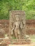 Numerous excavations by the Archaeological Survey of India (ASI) have been conducted at Udayagiri since 1958.[4] The Udayagiri Site 1, the first site to be excavated, is in a depression between two valleys.[2] In the excavations done between 1985–86 and 1989–90 at the Udayagiri Site 2, the antiquities exposed consisted of a Buddhist Monastic complex enclosed within a compound wall, including a stupa of 7 metres (23 ft) height with four images of dhyani Buddhas fixed at its four cardinal points. On the basis of the epigraphical evidence, archaeologist have inferred that this site is "Madhavapura Mahavihara". During the large excavation from 1997 to 2000, a second part of Udayagiri-2 was discovered with additional stupas and monasteries. These antiquities consist of two eighth century monastic complexes, statues of Buddha, Tara, Manjusri, Avalokiteśvara, Jatamukuta Lokesvara and many terracotta (earthenware) seals.[4] A stepped stone well with epigraphic inscriptions has also been discovered.[1] Also seen near one of the entry gates at the site is a human figure swinging on a rope, with eyes closed, in a state of perfect happiness.[2]