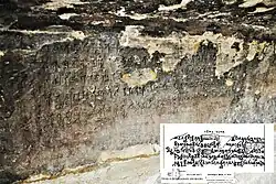 Outside the cave is a panel with an inscription that mentions Gupta year 82 (401 CE), and that the Gupta king Chandragupta II and his minister Virasena visited this cave.[56] In the ceiling of the cave is an undated pilgrim record of somebody named Śivāditya.[57]