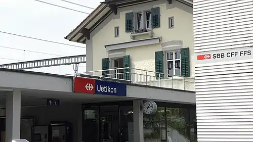 Uetikon is a railway station in the Swiss canton of Zurich, on the eastern shore of Lake Zurich (Goldcoast). The station takes its name from the municipality of Uetikon am See, and is located on the border of that municipality and the adjoining municipality of Männedorf.[4] Uetikon railway station is situated on the Lake Zurich right bank railway line,[5] within fare zone 142 of the Zürcher Verkehrsverbund (ZVV).[3]