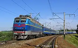Railways in Ukraine use various gauge types. The broad gauge (1,520 mm), a legacy of Imperial Russian and Soviet times, dominates the landscape, and narrow-gauge railways (750 mm) also exist, but plans are being made to construct, restore or switch to more standard-gauge railways (1,435 mm) for better train connections with the rest of Europe.[19] About half of railways in Ukraine are electrified (some of which have been damaged during the ongoing Russo-Ukrainian War and temporarily switched to diesel trains).[20]