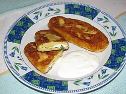 - Syrnyky: fried quark fritters, sometimes with raisins, served with sour cream, jam (varennia), honey or apple sauce.
