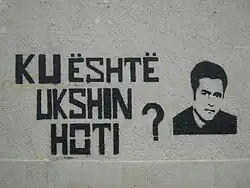 Ukshin Hoti was a Kosovo Albanian philosopher and activist. Hoti was a professor of international law and later philosophy at the University of Pristina and founder of UNIKOMB, a political party of Kosovo. Since 1982 he had been arrested several times by Yugoslav authorities. In 1994 he was convicted to five years in the Dubrava prison. In May 1999, when his sentence ended and he was to be released, the prison guards transferred him to an unknown location.[1] His whereabouts remain unknown and many human rights activists consider him dead.