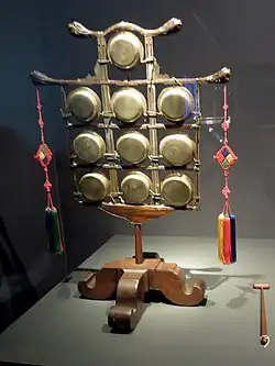 The ulla (Korean운라; Hanja雲鑼; 雲羅) is a traditional Korean percussion instrument comprising a set of ten small tuned gongs in a wooden frame. They are struck with a mallet.[1][2] Each of the gongs are the same size, but they produce different sounds due to their differing thickness.[2]