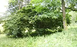 A specimen stood in the Arboretum national des Barres, Nogent-sur-Vernisson, France, in the 1930s.[7] 'Hillier' was introduced to the US in 1954 as Ulmus hillieri.[9] An old low shrub-elm in Stanmer Park Arboretum, Brighton (2018, now storm-damaged),[10] planted in the winter of 1965-6, with level rather than pendulous branching and leaves closely matching 'Hillieri' herbarium specimens in Kew Herbarium[11] and the Arboretum national des Barres,[7] was said (2018) by Hillier Nurseries, who supplied many elms to the arboretum, to be 'Hillieri',[12] though it is about 4 m tall and lacks crimson autumn colour. Dutch authorities who examined the tree in 2010 conjectured Japanese Elm hybrid.[13]