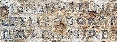 In August 2022, a basilica was discovered in the 4th sector of the archaeological park, located within the 19-hectares fortified section that is located to the north-east of the rest of the city.[13] The basilica, being 70 m (230 ft) long and 20 m (66 ft) wide is the largest in Ulpiana and one of the largest in the region, and is believed to have belonged to the Archbishop of Ulpiana. The floor of the basilica has many mosaics which are currently being unearthed.[22] In 2023, a mosaic related to Emperor Justinian the Great was discovered in the basilica. The mosaic shows that the basilica's construction was commissioned by Justinian himself and possibly dedicated to his wife Theodora. The currently-unveiled text also makes mention of a city in Dardania, which is most likely Ulpiana itself. Archaeologists believe that this suggests that Dardania had some sort of autonomous identity and was not fully Romanized by the 6th century.[13] As of August 2023, the mosaic has not been unveiled completely, with the rest of it expected to be revealed by October 2023. The dedication is written in the Latin language, despite being made by a Byzantine emperor.[23]