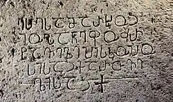 In total about 24 interments were discovered in the crypt.[6] Per sex estimation for human skeletons, all of them were adult males, as would be expected in a monastery.[7] The occupant of the most important tomb identified by a Georgian inscription was a "Georgian bishop Iohane" (John in Old Georgian), who was also the oldest and his age underlined his special status.[8] He would have been aged 66 or 67 when he died, and had suffered from osteoporosis.[9] The inscription is the earliest known example for an ethnonym ႵႠႰႧႥႤႪႨ (kartveli i.e. Georgian) on any archaeological artifact, both in the Holy Land and in Georgia.[10][11]