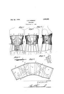In 1921, Herrick patented a brassiere that snugly fit the wearer and was retained in proper position without the use of shoulder straps. The garment supported the figure and permitted freedom of movement of the arms and body without being displaced by those same movements.[7]