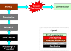 An SF UW campaign is now defined to have seven steps, ending in combat and demobilization. Changing concepts in UW, however, may change the model so that the UW force avoids entering the main combat phase, but carries out critical support operations with the steps before it.