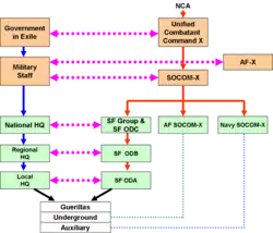 Note that dotted lines run from the underground and auxiliary to Navy and Air special operations units under the UCC Special Operations commander. These indicate that resupply might be brought in by sea or air, and the UW force will use other than the guerrilla force to receive them.[25] Indeed, the guerrillas might make a diversionary attack to draw attention from the logistics or other vulnerable operation.