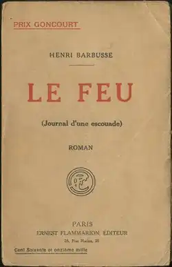 Under Fire: The Story of a Squad (French: Le Feu: journal d'une escouade) by Henri Barbusse (December 1916), was one of the first novels about World War I to be published. Although it is fiction, the novel was based on Barbusse's experiences as a French soldier on the Western Front. It was awarded the Prix Goncourt in 1916. The novel is described as one of the earliest works of the Lost Generation movement[1] or as the work which started it;[2] the novel had a major impact on the later writers of the movement, namely on Ernest Hemingway[3] and Erich Maria Remarque.[4]
