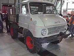 The Unimog 411 is a vehicle in the Unimog series from Mercedes-Benz. Daimler-Benz AG built 39,581 units at the Mercedes-Benz plant in Gaggenau between August 1956 and October 1974.[1] The 411 is the last series of the "original Unimogs". The design of the 411 is based on the Unimog 401. It is also a commercial vehicle built on a ladder frame with four equally sized wheels and designed as an implement carrier, agricultural tractor and universally applicable work machine. Like the 401, it had a passenger car engine, initially with 30 hp (22 kW).[2]