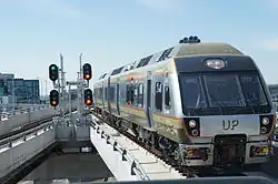 The Union Pearson Express (UP Express or simply UP)[3] is an airport rail link connecting Union Station in Downtown Toronto to Toronto Pearson International Airport. The UP Express began operation on 6 June 2015, in time for the 2015 Pan American Games.[2][4][5] The UP Express travels between Union and Pearson in 25 minutes[6] departing every 15 minutes, seven days a week.[7] At the launch announcement, it was stated that the UP Express was projected to carry 2.35 million passengers annually and eliminate approximately 1.2 million car trips in the first year.[2] As of 2019, it carried 4.5 million passengers annually.[1]