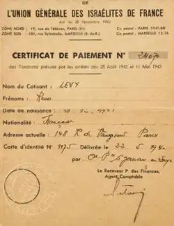 Dannecker proceeded from established German ordinance, to create such a body in the occupied zone,[56] but the military administrator (MBF. Militärbefehlshaber) instead preferred to collaborate with the Vichy regime by submitting a proposal to Xavier Vallat. He initially refused, but the French government conceded and created the Union Générale des Israélites de France (General Union of French Jews, UGIF) on 29 November 1941.[57] The law of 1941, like all the legislative measures taken by Vichy against the Jews since the first antisemitic statute of October 1940, marks a break with republican and secular traditions.[58] According to Article 1 of the Law of 29 November, the purpose of the UGIF