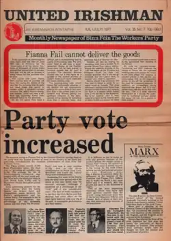 Other editors of the paper included Seán Cronin,[5] Seán Ó Brádaigh (1958–1960), Ruairí Ó Brádaigh,[6] Eoin Ó Murchú, Jackie Ward, Seamus Ó Tuathail, Denis Foley, and Tony Meade (1967). Contributors to the paper included Eamon McCann, Roy Johnston, Eamon Smullen, Eoghan Harris, and Sean Garland.[7][8][9] The United Irishman was replaced with The Irish People and Workers' Weekly in 1980.[10]